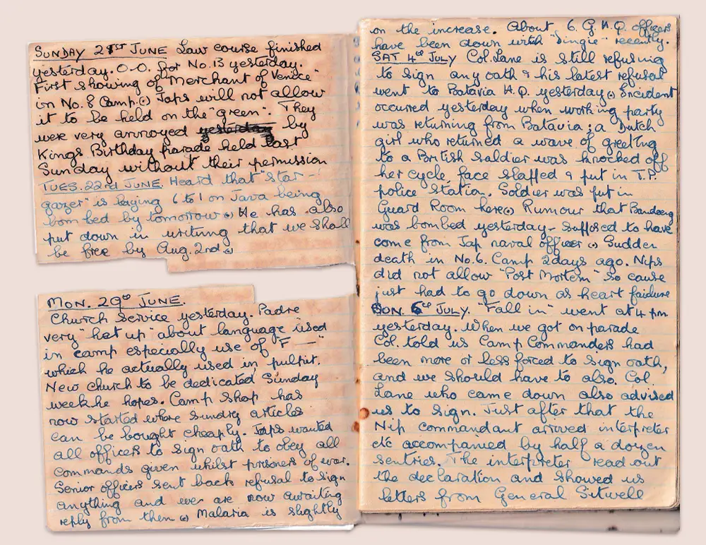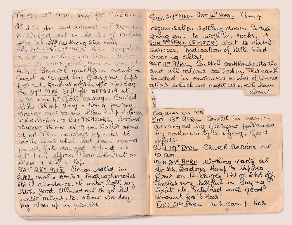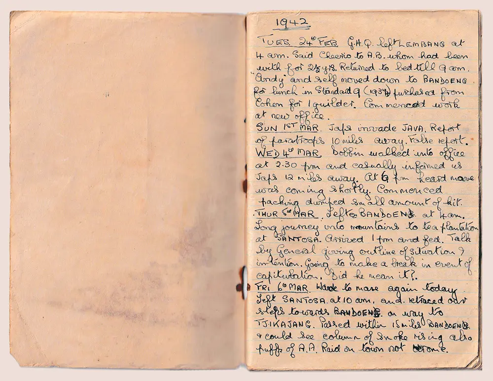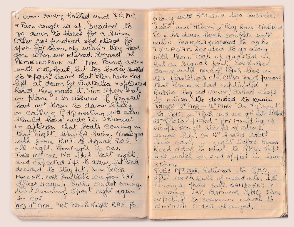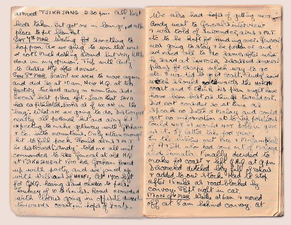 Returned to G.H.Q. after week full of incidents. I.E. Andy’s phone call BANDOENG & cursing3 JAP. Arrived G.H.Q. 2:30 pm4 expecting to commence march to BATAVIA. Orders changed.