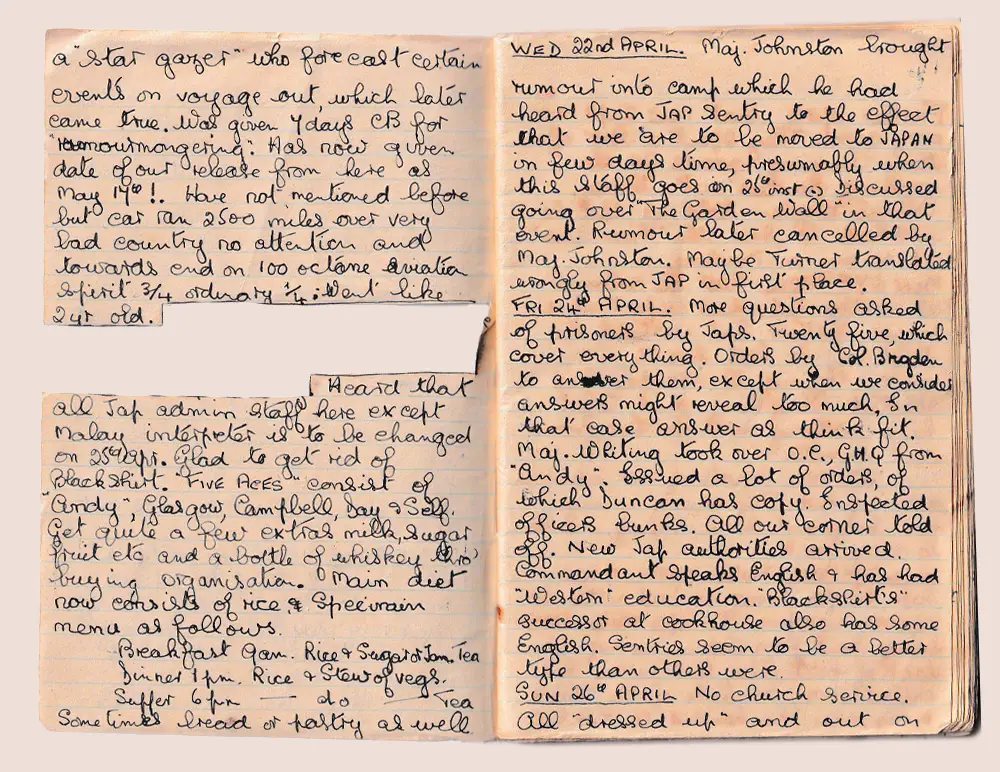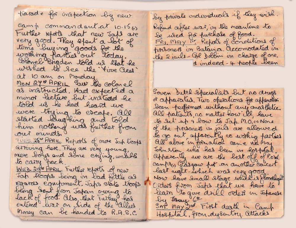 P.O.W. camps. Glasgow put on another concert last night – which was very good. Now have small stage which is floodlight. Orders from Japs that we have to learn to give drill orders in Japanese by May 6th.