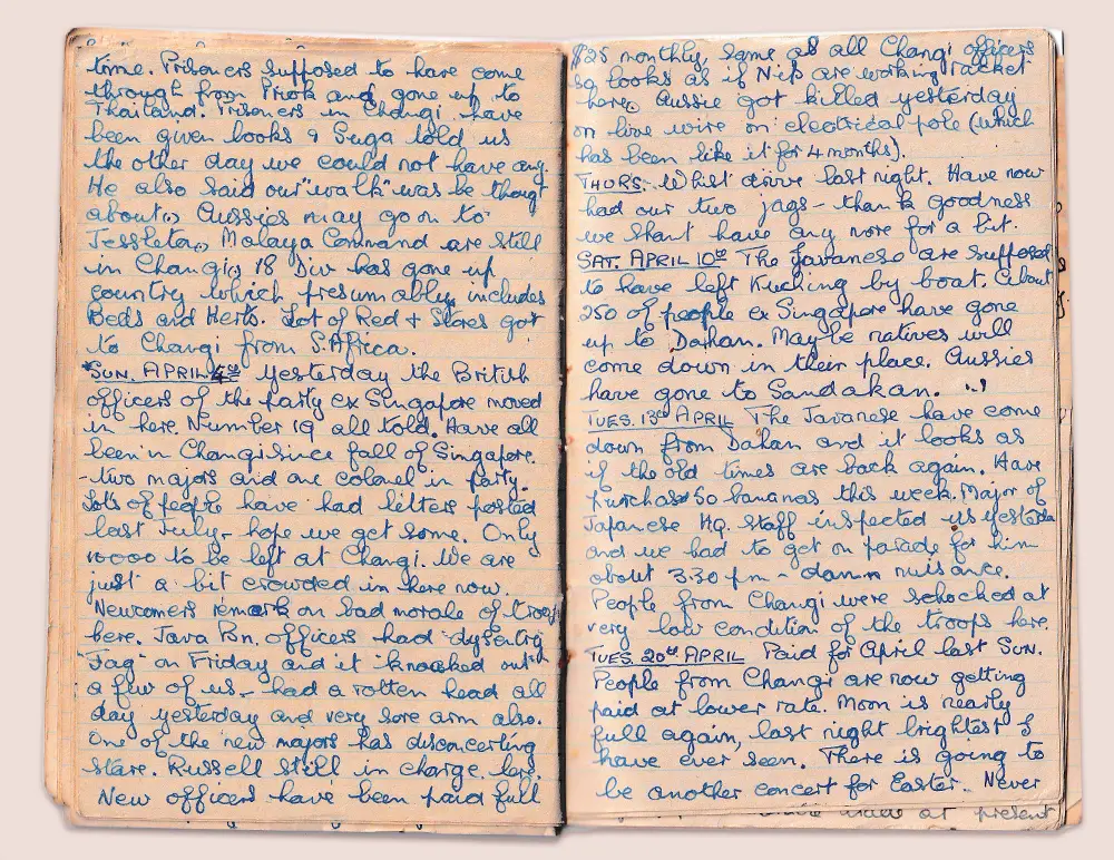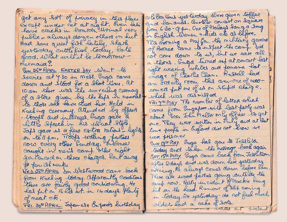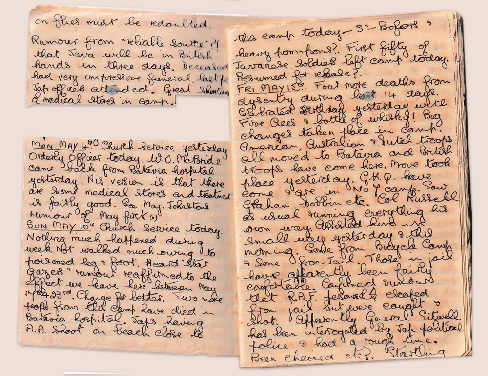 Church service today. Nothing much happened during week. Not walked much owing to poisoned leg & foot. Heard “star gazers” rumour reaffirmed to the effect we leave here between May 17th & 23rd. Change for better. Two more people from this camp have died in Batavia hospital. Japs having A.A. shoot on beach close to this camp today – 3 – Bofors & heavy pompoms? First fifty of Javanese solders left camp today. Presumed for release?