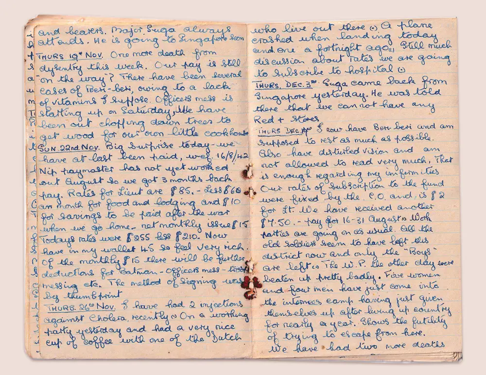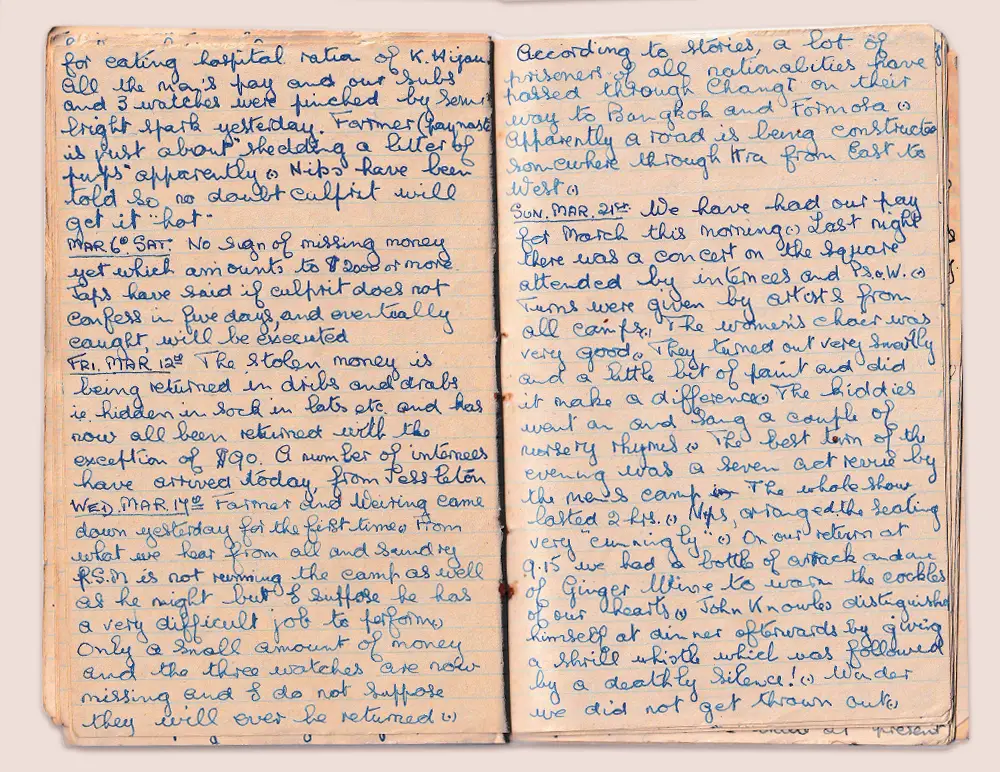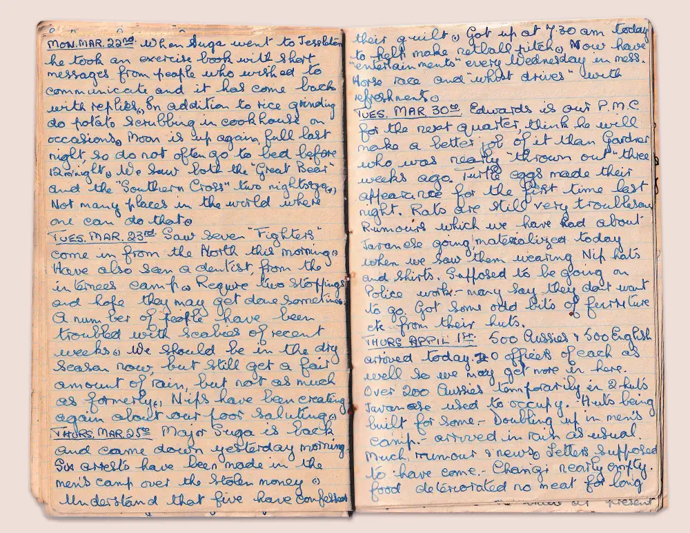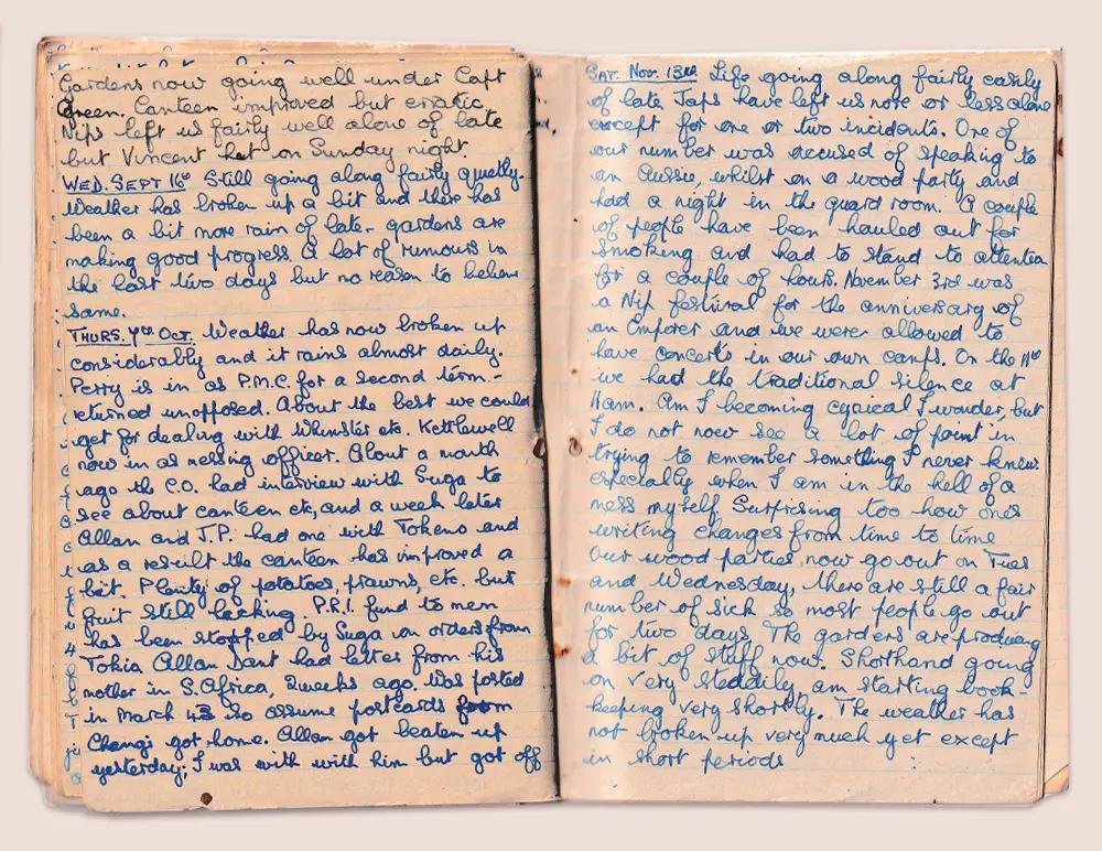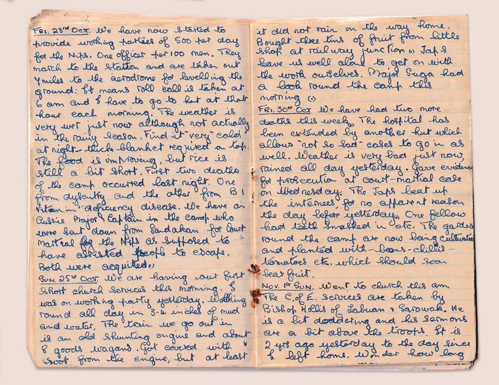 Life going along fairly easily of late. Japs have left us more or less alone except for one or two incidents. One of our number was accused of speaking to an Aussie, whilst on a wood party and had a night in the guard room. A couple of people have been jauled out for smoking and had to stand to attention for a couple of hours. November 3rd was a Nip festival for the anniversary of an Emporer and we were allowed to have concerts in our own camps. On the 11th we had the traditional silence at 11 am. Am I becoming cynical I wonder, but I do not now see a lot of point in trying to remember something I never knew, especially when I am in the hell of a mess myself. Surprising too how one’s writing changes from time to time. Our wood parties now go out on Tues and Wednesday, there are still a fair number of sick so most people go out for two days. The gardens are producing a bit of stuff now. Shorthand going on very steadily, am starting bookkeeping very shortly. The weather has not broken up very much yet except in short periods.