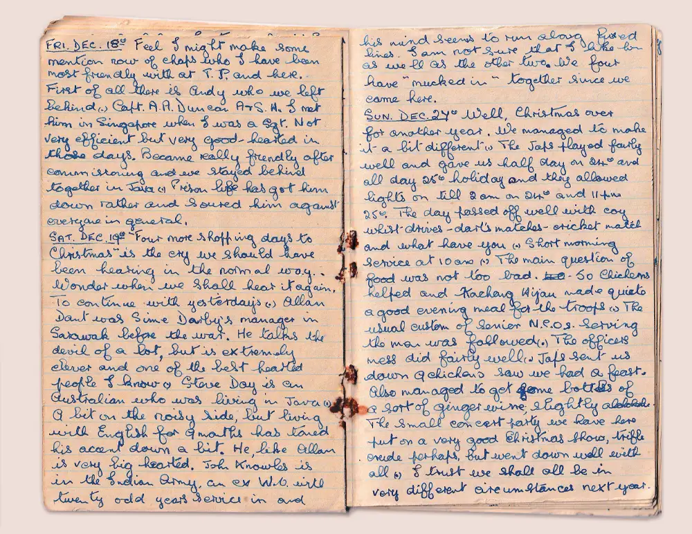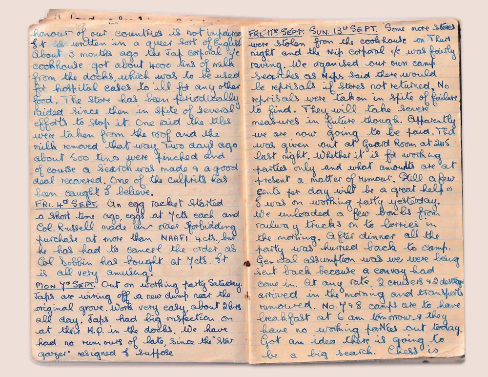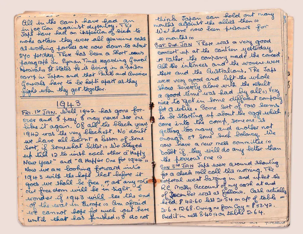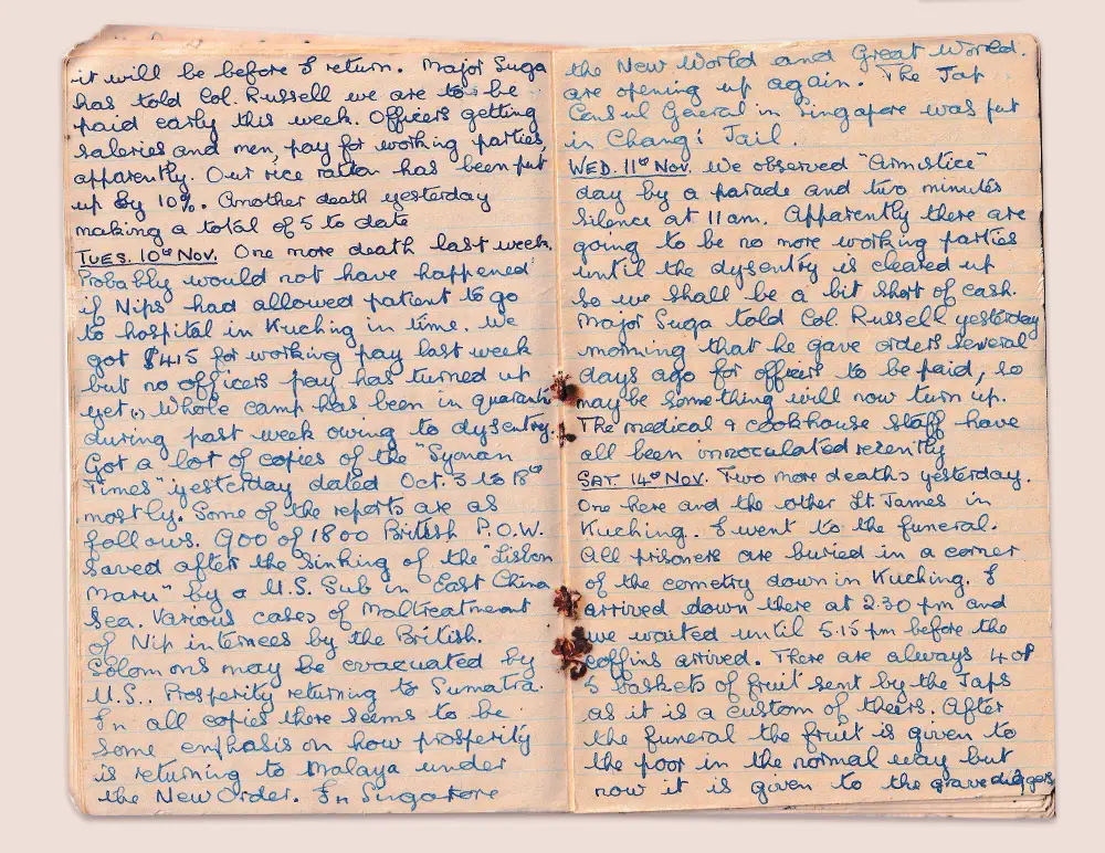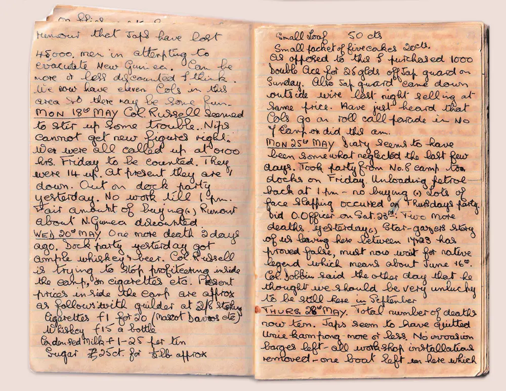Life going along fairly easily of late. Japs have left us more or less alone except for one or two incidents. One of our number was accused of speaking to an Aussie, whilst on a wood party and had a night in the guard room. A couple of people have been jauled out for smoking and had to stand to attention for a couple of hours. November 3rd was a Nip festival for the anniversary of an Emporer and we were allowed to have concerts in our own camps. On the 11th we had the traditional silence at 11 am. Am I becoming cynical I wonder, but I do not now see a lot of point in trying to remember something I never knew, especially when I am in the hell of a mess myself. Surprising too how one’s writing changes from time to time. Our wood parties now go out on Tues and Wednesday, there are still a fair number of sick so most people go out for two days. The gardens are producing a bit of stuff now. Shorthand going on very steadily, am starting bookkeeping very shortly. The weather has not broken up very much yet except in short periods.