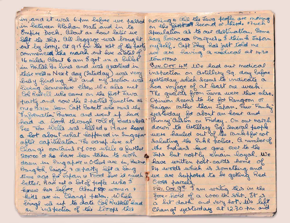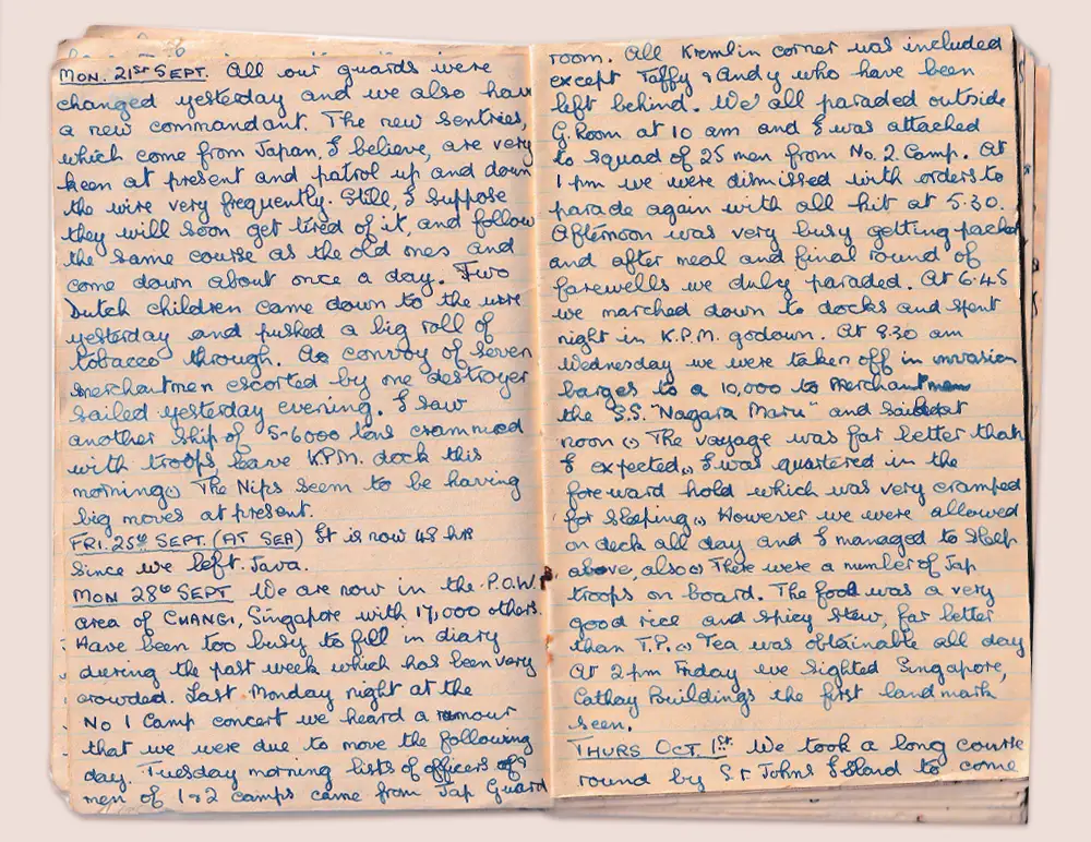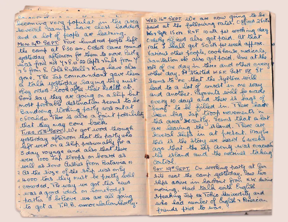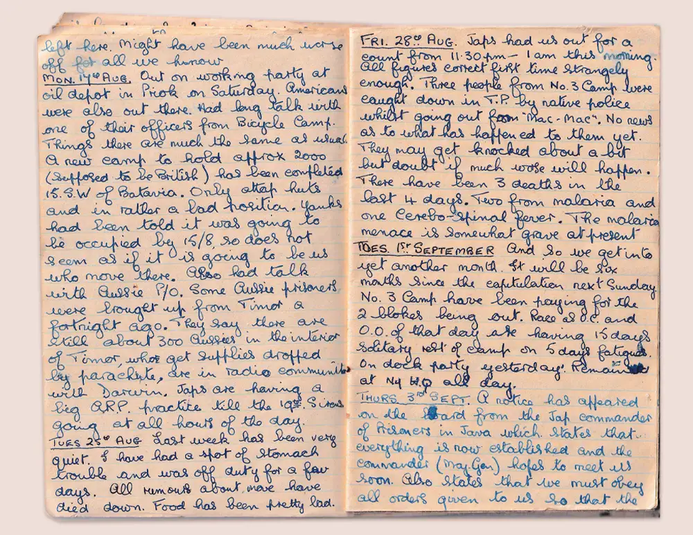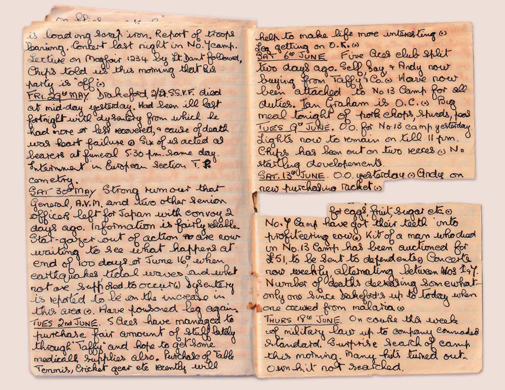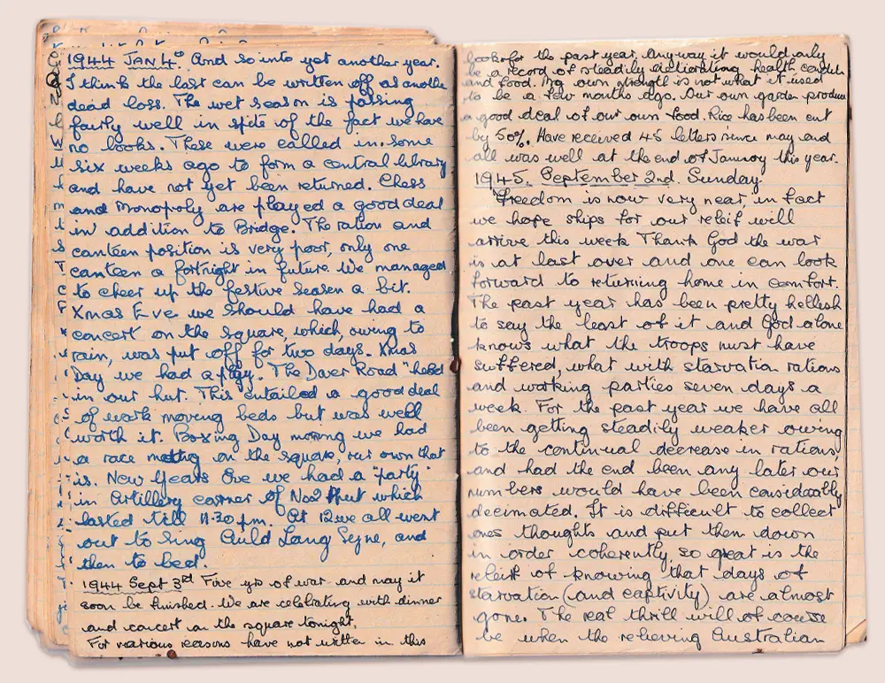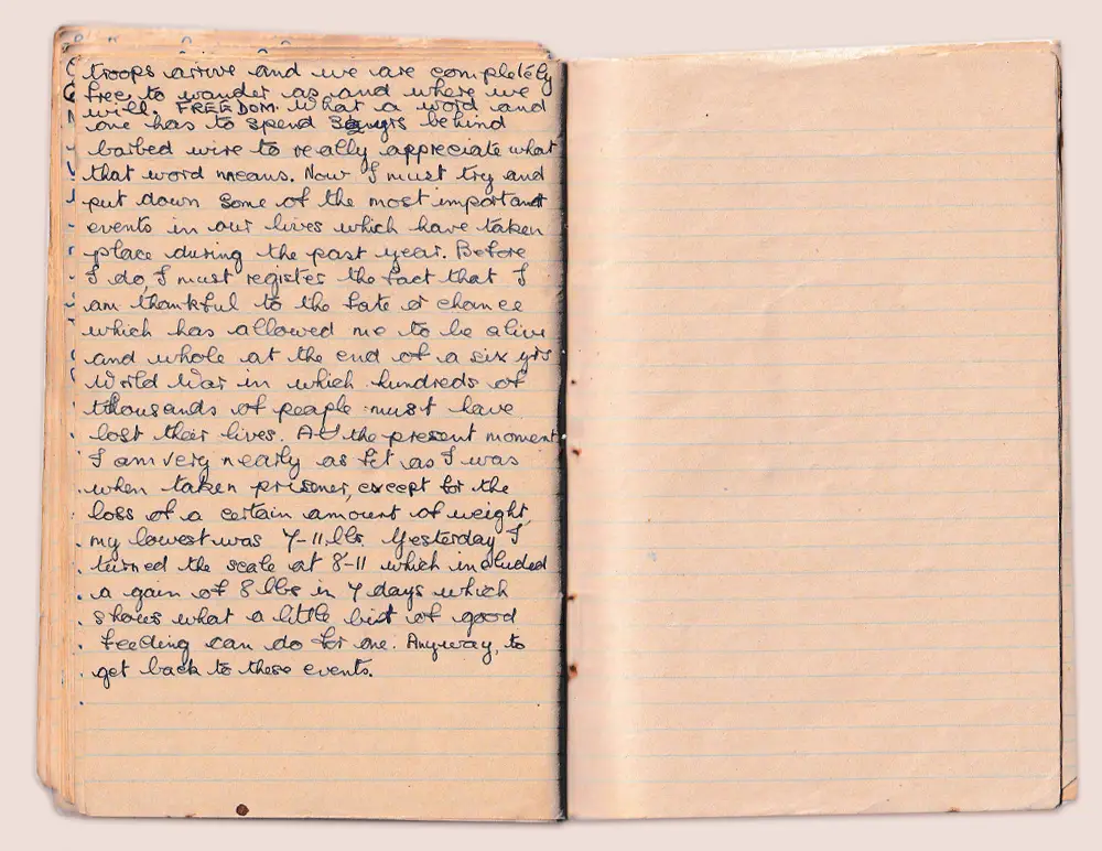 Freedom is now very near, in fact we hope ships for our relief will arrive this week. Thank God the war is at last over and one can look forward to returning home in comfort. The past year has been pretty hellish to say the least of it and God alone knows what the troops must have suffered, what with starvation rations and working parties seven days a week. For the past year we have all been getting steadily weaker owing to the continual decrease in rations, and had the end been any later our numbers would have been considerably decimated. It is difficult to collect one’s thoughts and put them down in order coherently, so great is the relief of knowing that days of starvation (and captivity) are almost gone. The real thrill will of course be when the relieving Australian troops arrive and we are completely free to wander as and where we will. FREEDOM. What a word and one has to spend 3 ½ yrs behind barbed wire to really appreciate what that word means. Now I must try and put down some of the most important events in our lives which have taken place during the past year. Before I do I must register the fact that I am thankful to the fate or chance which has allowed me to be alive and whole at the end of a six yrs World War in which hundreds of thousands of people must have lost their lives. At the present moment I am very nearly as fit as I was when taken prisoner, except for the loss of a certain amount of weight, my lowest was 7 – 11 lbs. Yesterday I turned the scale at 8 – 11 which included a gain of 8 lbs in 7 days which shows what a little bit of good feeding can do for me. Anyway, to get back to these events
