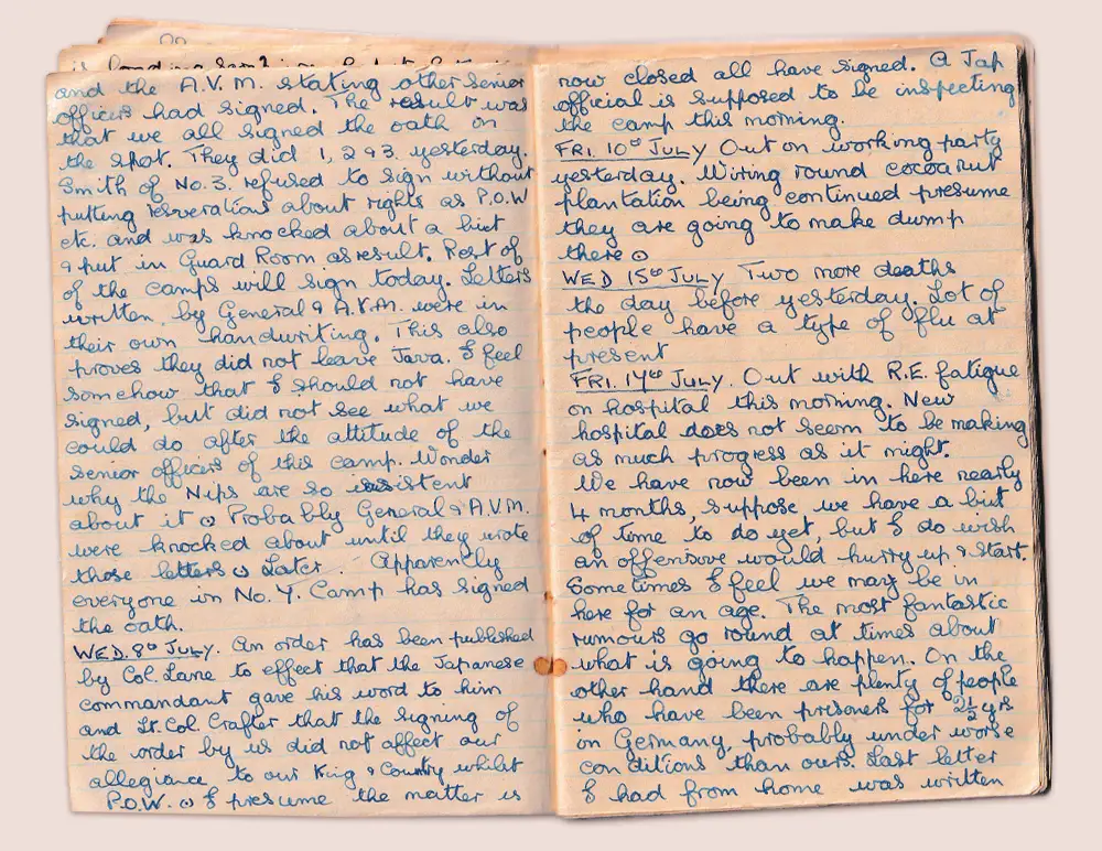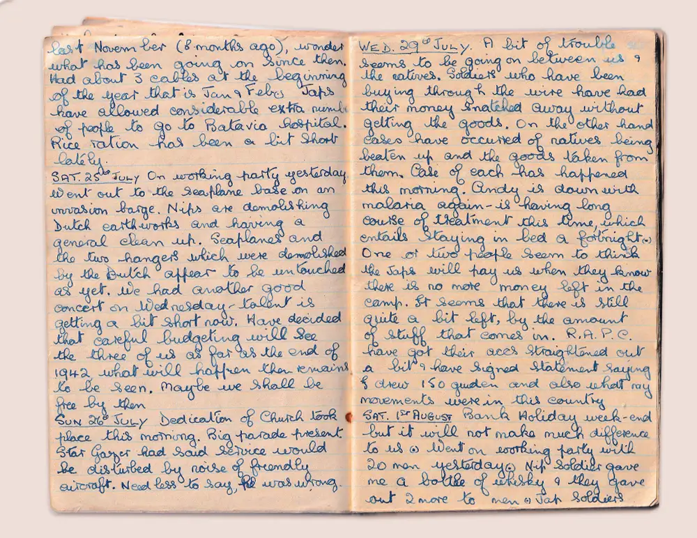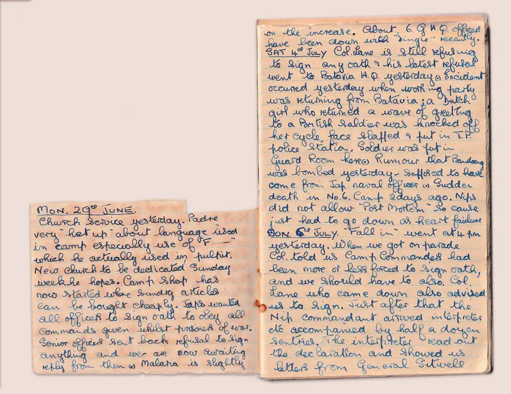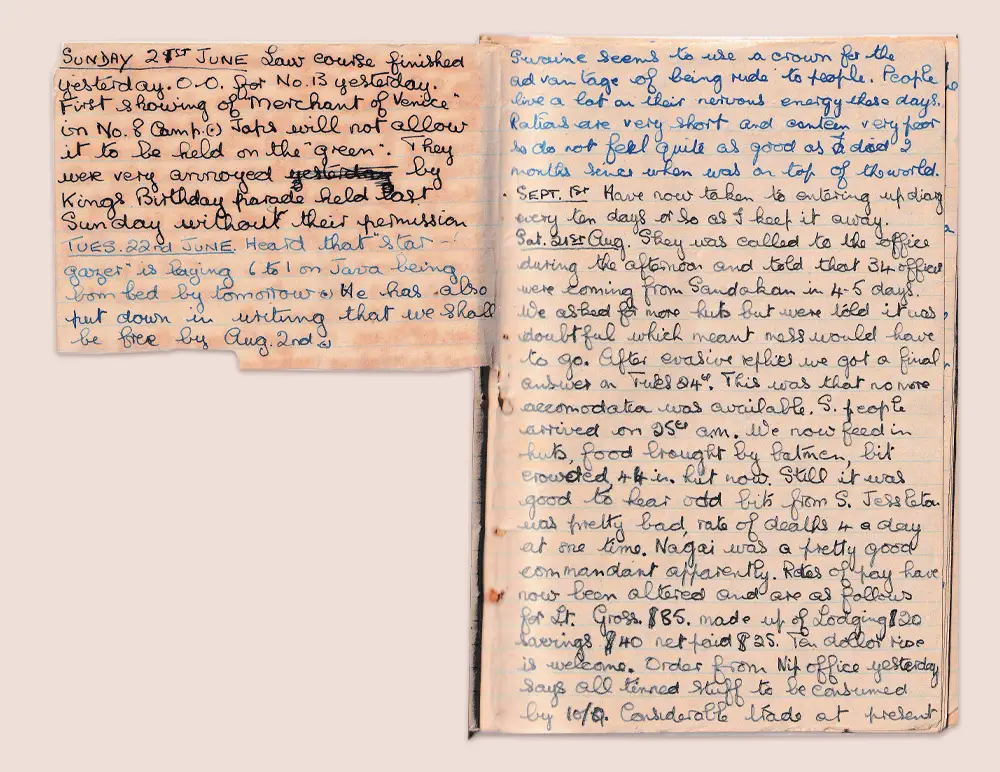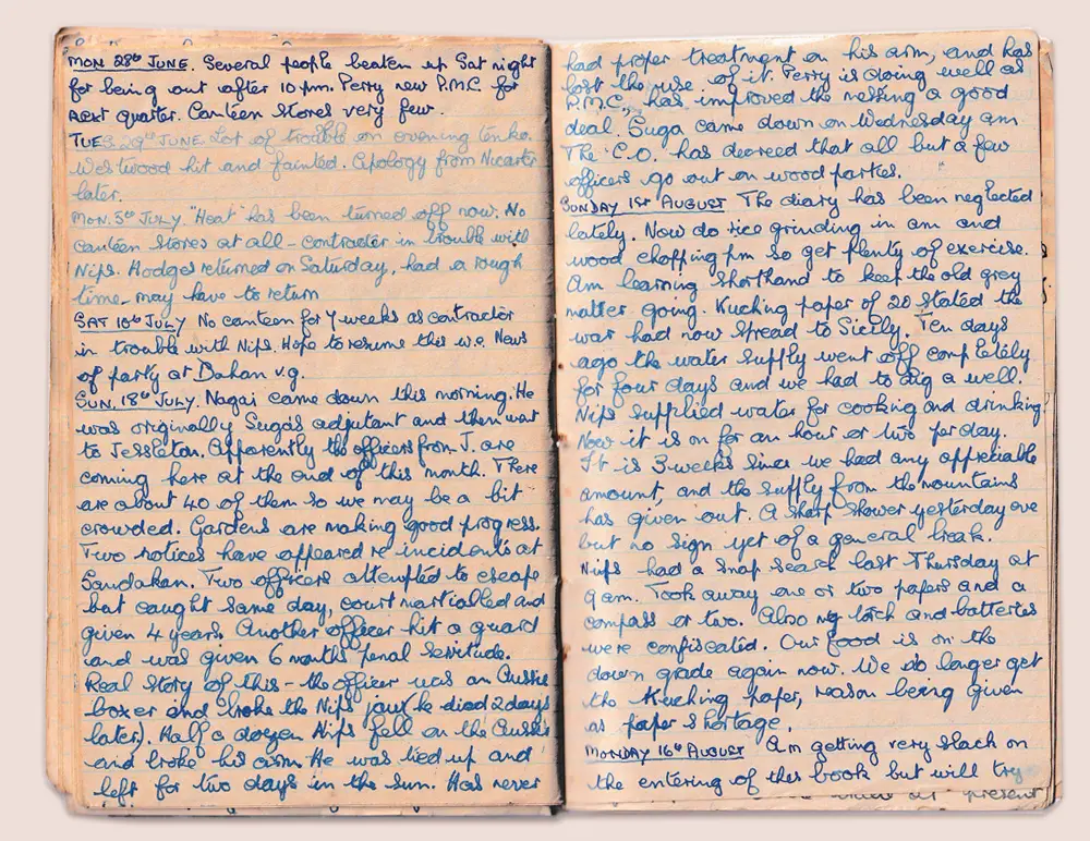 The diary has been neglected lately. Now do rice grinding in am and wood chopping pm so get plenty of exercise. Am learning shorthand to keep the old grey matter going. Kuching paper of 20 stated the war had now spread to Sicily. Ten days ago the water supply went off camp lately for four days and we had to dig a well. Nips supplied water for cooking and drinking. Now it is on for an hour or two per day. It is 3 weeks since we had any appreciable amount, and the supply from the mountains has given out. A short shower yesterday eve but no sign yet of a general break. Nips had a snap search last Thursday at 9 am. Took away one or two papers and a compass or two. Also my torch and batteries were confiscated. Our food is on the down grade again now. We no longer get the Kuching paper, reason being given as paper shortage.