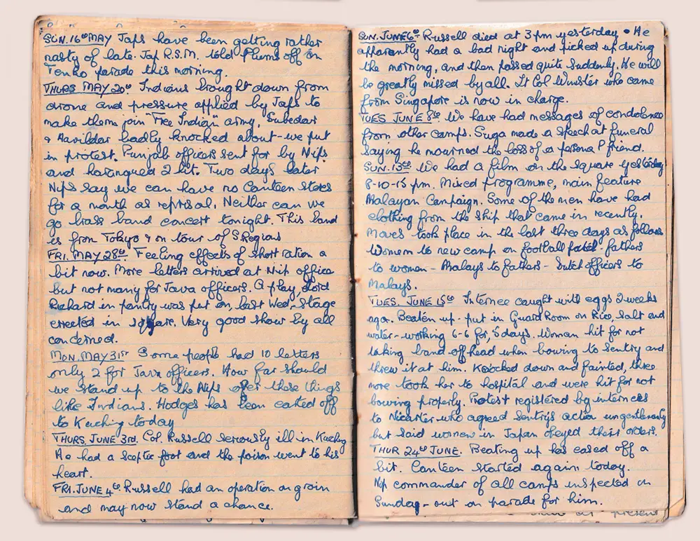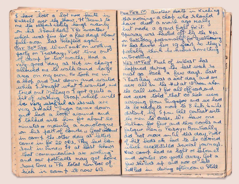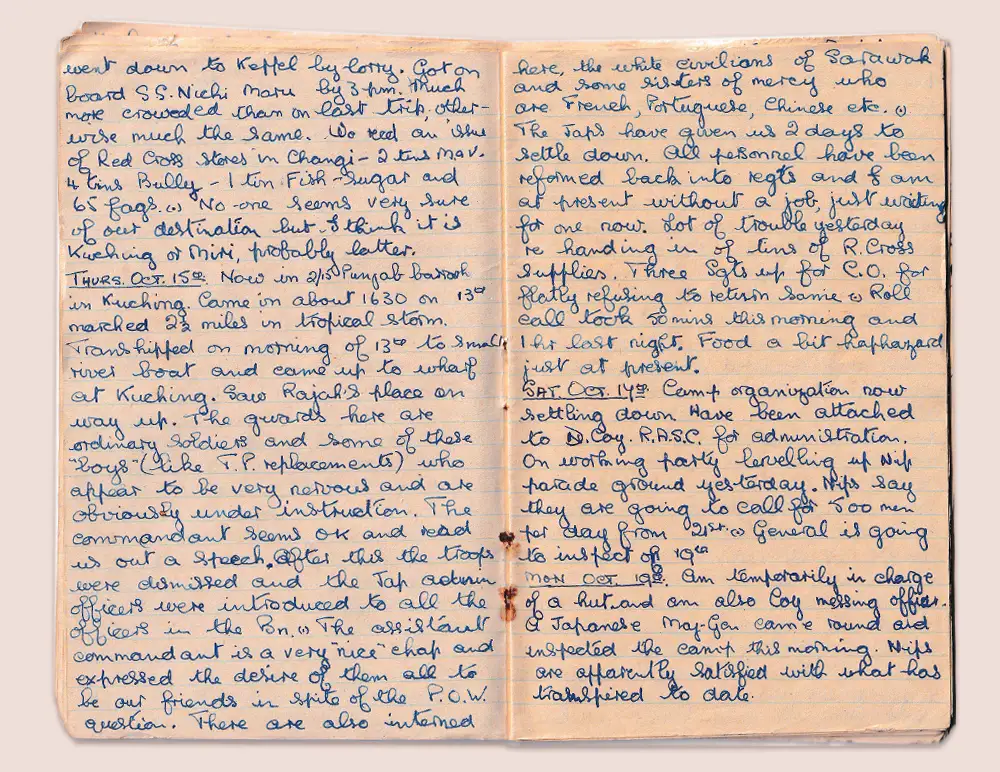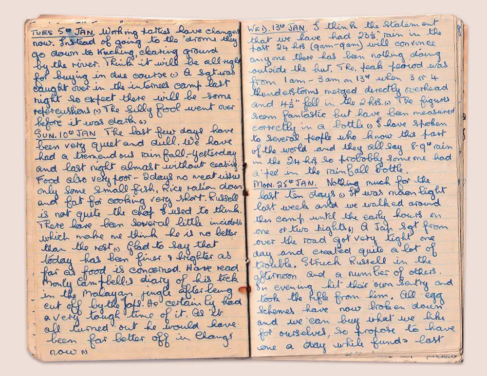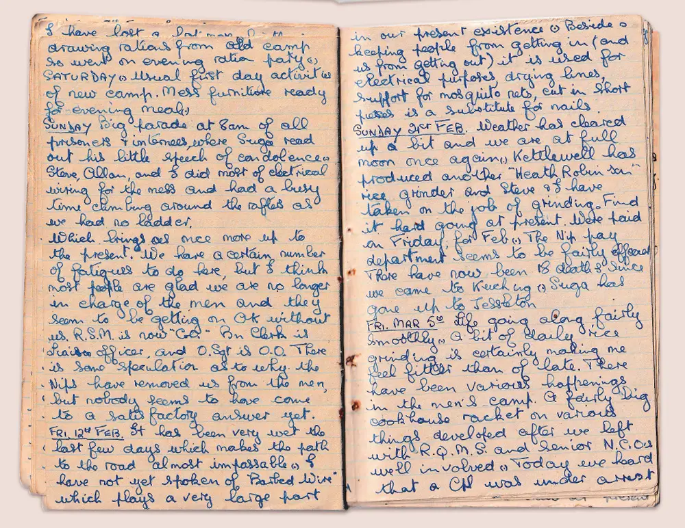 The diary has been neglected lately. Now do rice grinding in am and wood chopping pm so get plenty of exercise. Am learning shorthand to keep the old grey matter going. Kuching paper of 20 stated the war had now spread to Sicily. Ten days ago the water supply went off camp lately for four days and we had to dig a well. Nips supplied water for cooking and drinking. Now it is on for an hour or two per day. It is 3 weeks since we had any appreciable amount, and the supply from the mountains has given out. A short shower yesterday eve but no sign yet of a general break. Nips had a snap search last Thursday at 9 am. Took away one or two papers and a compass or two. Also my torch and batteries were confiscated. Our food is on the down grade again now. We no longer get the Kuching paper, reason being given as paper shortage.