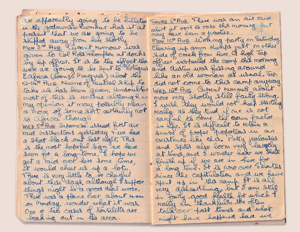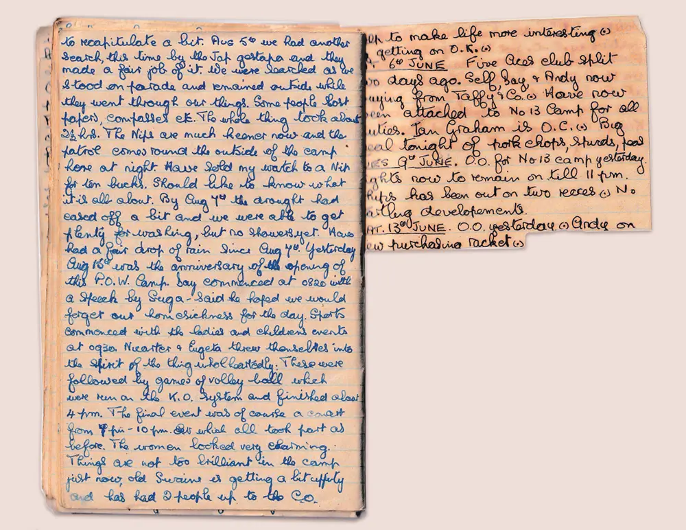 Am getting very slack on the entering of this book but will try to recapitulate a bit. Aug 5th we had another search, this time by the Jap Gestapo and they made a fair job of it. We were searched as we stood on parade and remained outside while they went through our things. Some people lost papers, compasses etc. The whole thing took about 2 ½ hrs. The Nips are much keener now and the patrol comes round the outside of the camp here at night. Have sold my watch to a Nip for ten bucks. Should like to know what it is all about. By Aug 7th the drought had eased off a bit and we were able to get plenty for washing, but no showers yet. Have had a fair drop of rain since Aug 7th. Yesterday Aug 15th was the anniversary of the opening of this P.O.W. camp. Day commenced at 0820 with a speech by Suga – said he hoped we would forget our homesickness for the day. Sports commenced with the ladies and childrens events at 0930. Nicarter and Eugeta threw themselves into the spirit of the thing wholeheartedly. These were followed by games of volley ball which were run on the K.O. system and finished about 4 pm. The final event was of course a concert from 7 pm – 10 pm in which all took part as before. The women looked very charming. Things are not too brilliant in the camp just now, old Swaine is getting a bit uppity and has had 2 people up to the C.O. Swaine seems to use a crown for the advantage of being rude to people. People live a lot on their nervous energy these days. Rations are very short and canteen very poor so do not feel quite as good I did 2 months since when was on top of the world.